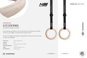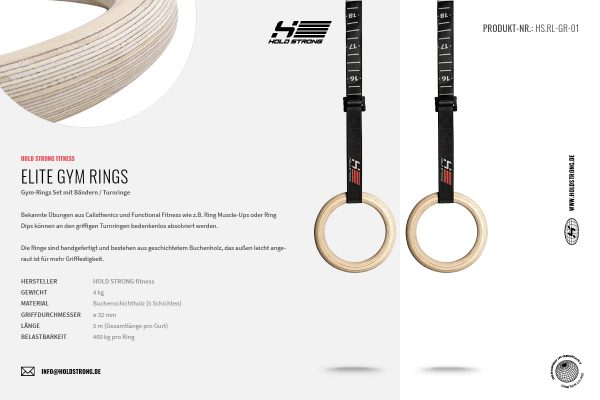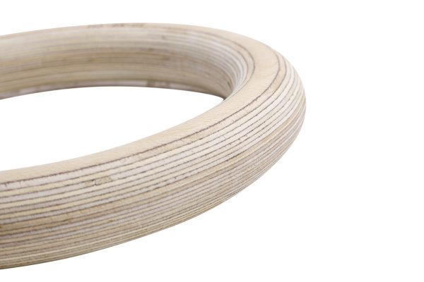Die Ringe sind handgefertigt und bestehen aus geschichtetem Buchenholz, das außen leicht angeraut ist für mehr Grifffestigkeit. Die Maße sind so ausgesucht, dass sie die ergonomischen Anforderungen beim Greifen optimal umsetzen. Der innere Durchmesser beträgt 18 cm und der äußere 24,5 cm. Der Griff ist 32 mm dick und ermöglicht komfortables Greifen.