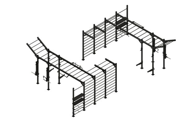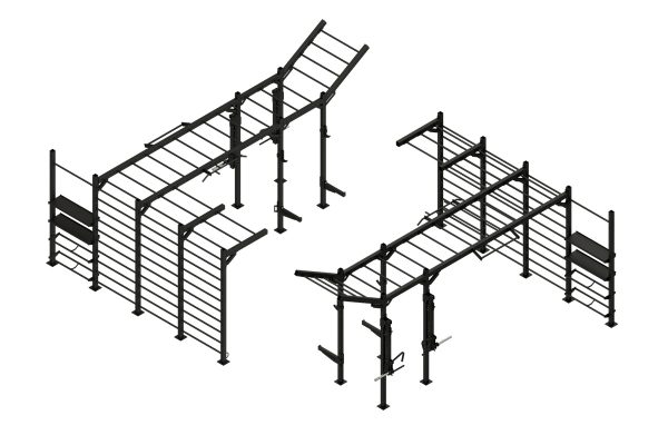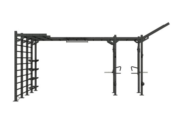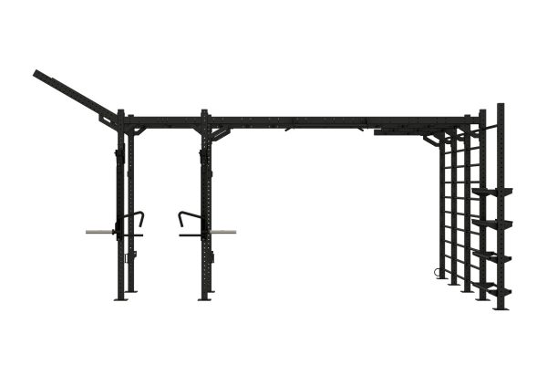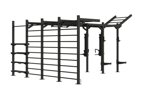 Das System von HOLD STRONG Fitness besteht aus Sprossenwänden, einer Hangelleiter und weiteren Trainingsstationen, die nach Wunsch auch ergänzt werden können. Die gesamte Konstruktion ist Schwarz.