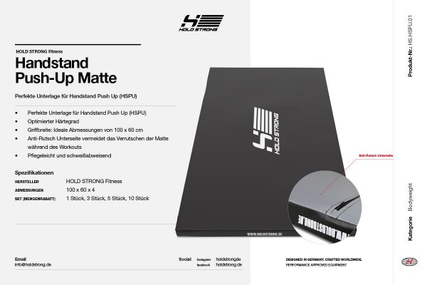 Die HOLD STRONG Fitness HSPU Matte findet mit ihrer 4 cm-Dicke den Sweetspot zwischen weich und hart – für ein so professionelles wie sicheres und gesundes Training.