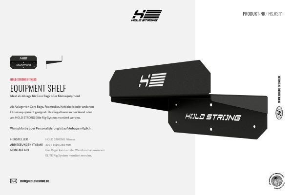 Als Ablage von Core Bags, Foamroller, Kettlebells oder anderem Fitnessequipment geeignet. Das Regal kann an der Wand oder am HOLD STRONG Elite Rig-System montiert werden.