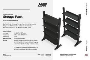 | Ablagen | Geneigte Ablagen ermöglichen leichtes Ablegen der HEX-Hanteln. Die zwei verfügbaren Neigungswinkel können bei der Montage bestimmt werden. In der waagerechten lassen sich Kettlebells oder anderes Fitness-Equipment ordentlich ablegen. |