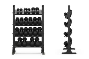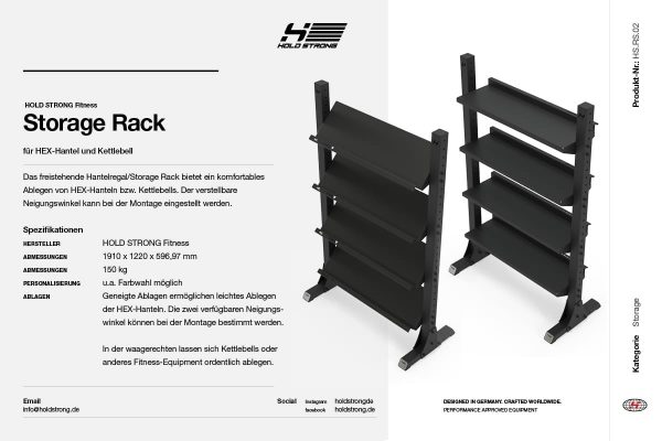 Das freistehende Hantelregal/Storage Rack bietet ein komfortables Ablegen von HEX-Hanteln bzw. Kettlebells. Der verstellbare Neigungswinkel kann bei der Montage eingestellt werden.