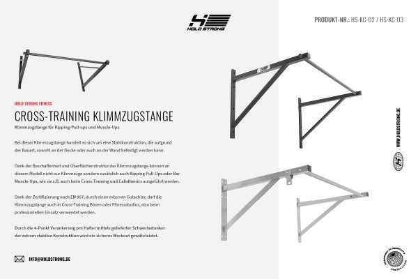 Die Klimmzugstange HS-KC-03 von HOLD STRONG Fitness kann an der Wand sowie an der Decke montiert werden. Die Konstruktion bietet einen komfortablen Abstand von 75cm und kann mit bis zu 350kg belastet werden. Somit sind alle Übungen wie Muscle-ups, Chest to bar pull-ups, toes to bar an dieser Klimmzugstange möglich.