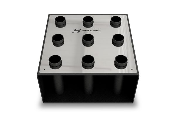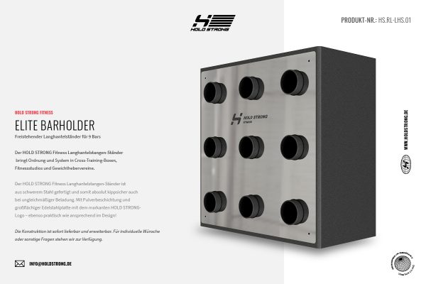 Der HOLD STRONG Fitness Langhantelstangen-Ständer ist aus schwerem Stahl gefertigt und somit absolut kippsicher auch bei ungleichmäßiger Beladung. Mit Pulverbeschichtung und großflächiger Edelstahlplatte mit dem markanten HOLD STRONG-Logo – ebenso praktisch wie ansprechend im Design!