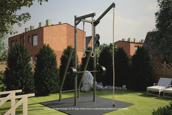Um alle Möglichkeiten unseres Outdoor Rigs auszuschöpfen empfehlen wir zusätzlich den Kauf von Turnringen und Straps, einem Kletterseil und Wall Balls. Je nach Bodenbeschaffenheit sollte zudem an geeigneten Bodenschutz gedacht werden – hier stehen wir gern mit Rat und Tat zur Seite.